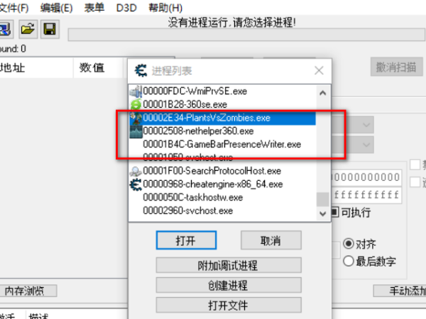 3、点击文件 打开进程,然后找到你的游戏进程,点击它,然后打开。