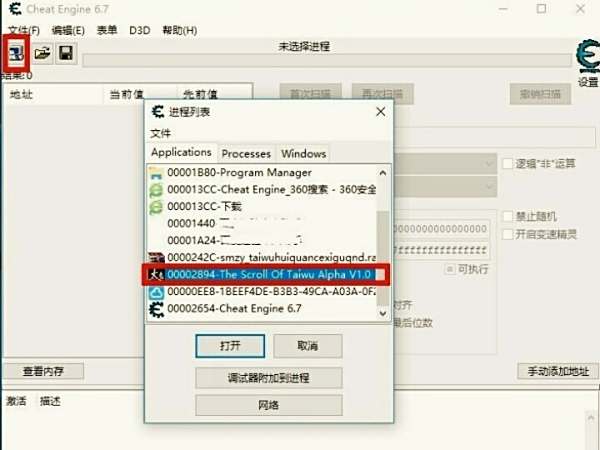 打开CE点击左上角小电脑(在闪)样的图标。 在弹出的窗口 点最后一项或倒数第二项有你开游戏那个浏览器的图标载入内存。