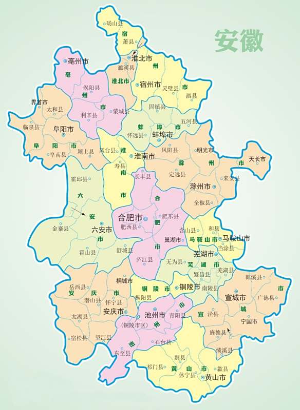 安徽襟江带淮,沿江通海,经济繁荣,教育发达。下辖宿州、淮北、亳州、阜阳、蚌埠、淮南、滁州、六安、马鞍山、安庆、芜湖、铜陵、宣城、池州、黄山等16个地级市。