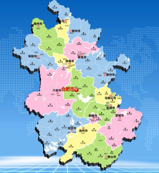 安徽襟江带淮,沿江通海,经济繁荣,教育发达。下辖宿州、淮北、亳州、阜阳、蚌埠、淮南、滁州、六安、马鞍山、安庆、芜湖、铜陵、宣城、池州、黄山等16个地级市。