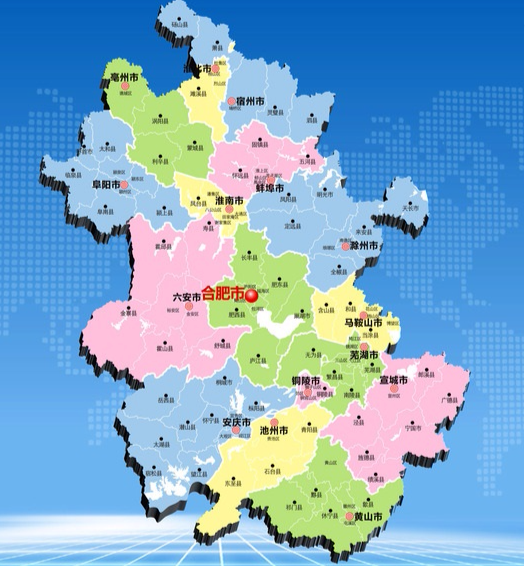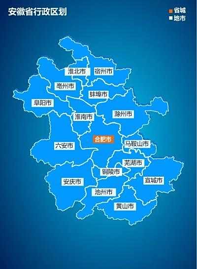 下辖宿州、淮北、亳州、阜阳、蚌埠、淮南、滁州、六安、马鞍山、安庆、芜湖、铜陵、宣城、池州、黄山等16个地级市。地跨长江、淮河南北,新安江穿行而过。