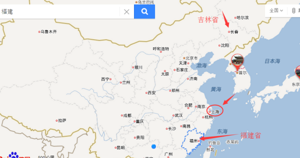 上海市到吉林省比较近一些,福建省到吉林省比较远,因为福建省在地理位置上是位于上海市的西南部。如图所示。