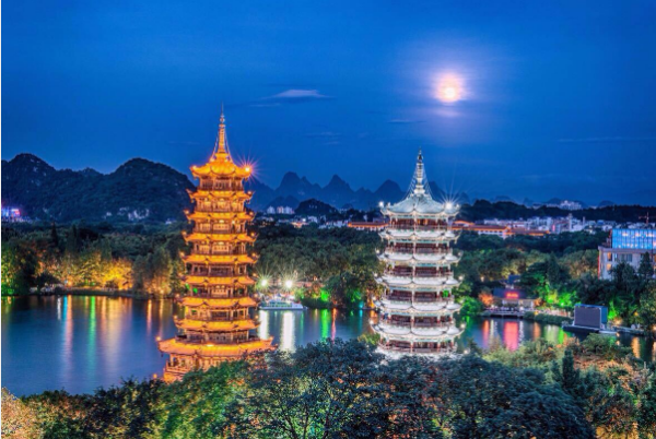 两江四湖包括桂林市区的漓江、桃花江、杉湖、榕湖、桂湖和木龙湖。它是环绕桂林市中心的一条美丽的风景带,也是桂林的一张风景名片。乘船是游览两江四湖的主要方式,尤其是在晚上,可以从多个角度欣赏桂林的夜景。