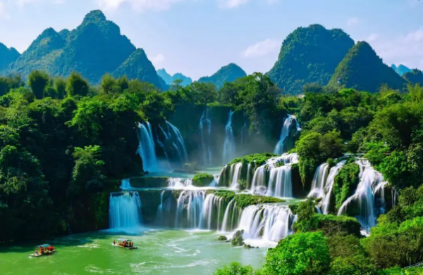 它横跨中国和越南,有200多米宽。是亚洲首屈一指的大瀑布,也是世界第二大跨国瀑布,也是电影和电视剧《花千骨》的拍摄地之一。瀑布的源头是中越两国的界河—归春河,它流入越南又流回广西,经大新县德天村,再从60米高的断崖三级跌落,形成了壮观的德田瀑布景观。