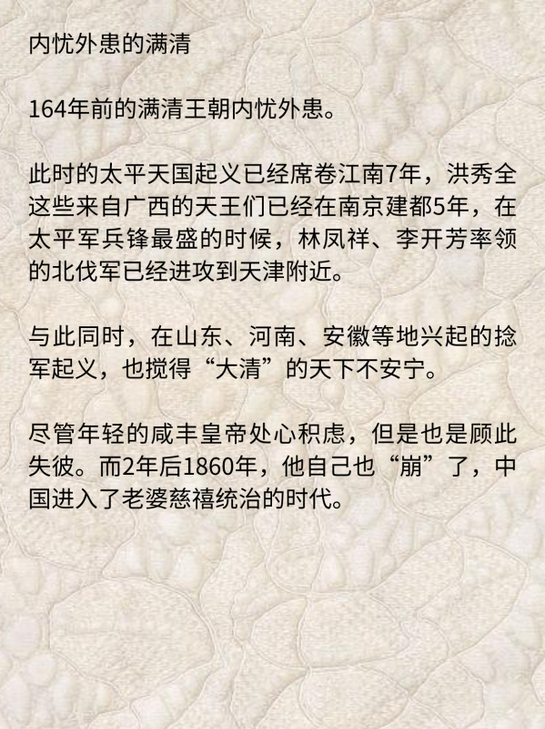 尽管年轻的咸丰皇帝处心积虑,但是也是顾此失彼。而2年后1860年,他自己也“崩”了,中国进入了老婆慈禧统治的时代。