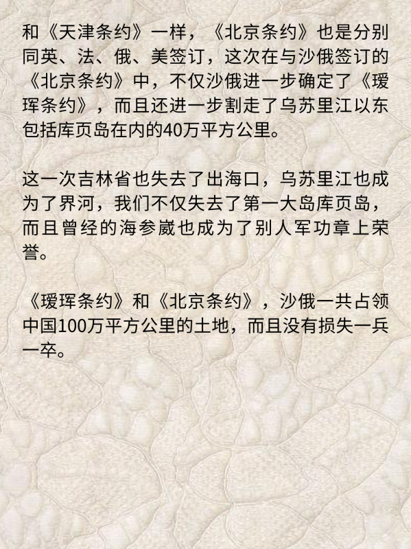 这一次吉林省也失去了出海口,乌苏里江也成为了界河,我们不仅失去了第一大岛库页岛,而且曾经的海参崴也成为了别人军功章上荣誉。