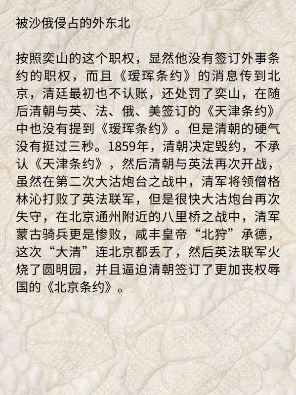按照奕山的这个职权,显然他没有签订外事条约的职权,而且《瑷珲条约》的消息传到北京,清廷最初也不认账,还处罚了奕山,在随后清朝与英、法、俄、美签订的《天津条约》中也没有提到《瑷珲条约》。但是清朝的硬气没有挺过三秒。