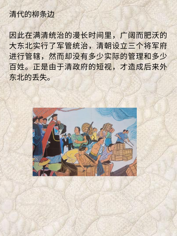 但是清朝却恰恰相反,他们把东北当成了满清自己的后院,不允许汉人进行开发。在清朝的版图之上,汉人只允许在汉地生活,不允许来到塞外和东北进行开拓,结果就是尽管满清早就是人口数亿的世界第一人口大国,但是在肥沃的东北大地上,仍旧是千里无人的荒凉之地,满清甚至在专门树立了一条柳条栅栏“柳条边”来阻止汉人进入东北开垦。