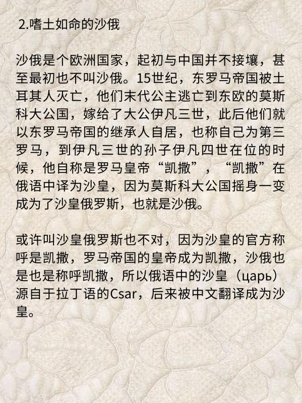 ”,到伊凡三世的孙子伊凡四世在位的时候,他自称是罗马皇帝“凯撒”,“凯撒”在俄语中译为沙皇,因为莫斯科大公国摇身一变成为了沙皇俄罗斯,也就是沙俄。