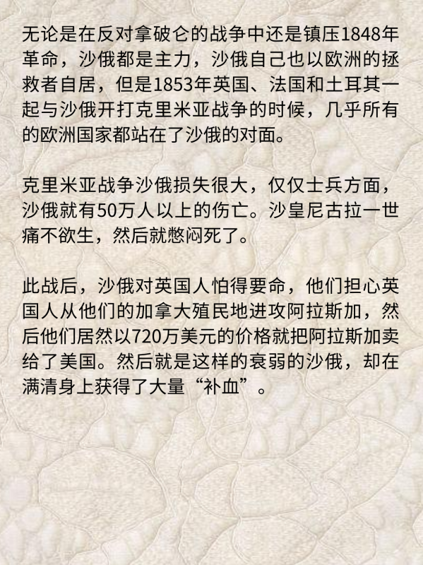 克里米亚战争沙俄损失很大,仅仅士兵方面,沙俄就有50万人以上的伤亡。沙皇尼古拉一世痛不欲生,然后就憋闷死了。