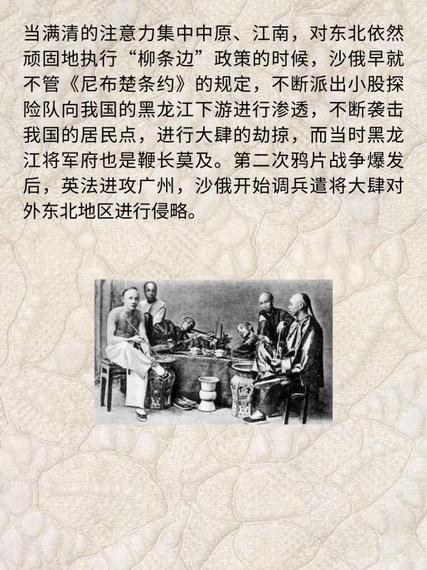 当满清的注意力集中中原、江南,对东北依然顽固地执行“柳条边”政策的时候,沙俄早就不管《尼布楚条约》的规定,不断派出小股探险队向我国的黑龙江下游进行渗透,不断袭击我国的居民点,进行大肆的劫掠,而当时黑龙江将军府也是鞭长莫及。第二次鸦片战争爆发后,英法进攻广州,沙俄开始调兵遣将大肆对外东北地区进行侵略。