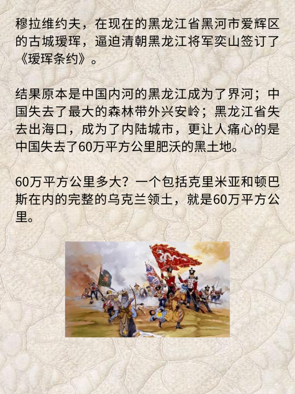 穆拉维约夫,在现在的黑龙江省黑河市爱辉区的古城瑷珲,逼迫清朝黑龙江将军奕山签订了《瑷珲条约》。
