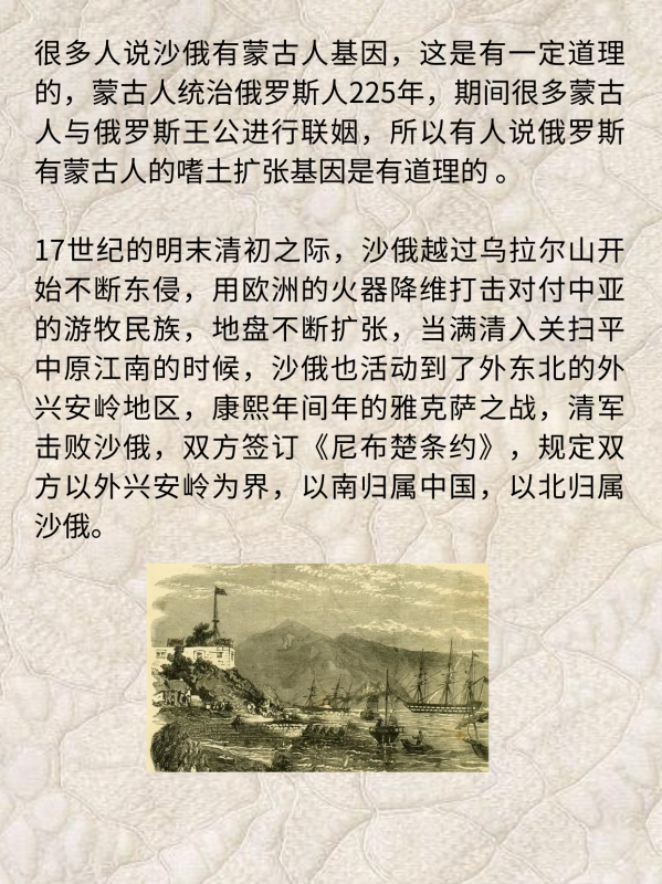 17世纪的明末清初之际,沙俄越过乌拉尔山开始不断东侵,用欧洲的火器降维打击对付中亚的游牧民族,地盘不断扩张,当满清入关扫平中原江南的时候,沙俄也活动到了外东北的外兴安岭地区,康熙年间年的雅克萨之战,清军击败沙俄,双方签订《尼布楚条约》,规定双方以外兴安岭为界,以南归属中国,以北归属沙俄。