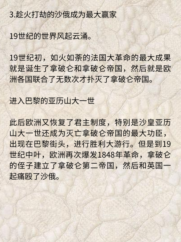 此后欧洲又恢复了君主制度,特别是沙皇亚历山大一世还成为灭亡拿破仑帝国的最大功臣,出现在巴黎街头,进行胜利大游行。但是到19世纪中叶,欧洲再次爆发1848年革命,拿破仑的侄子建立了拿破仑第二帝国,然后和英国一起痛殴了沙俄。