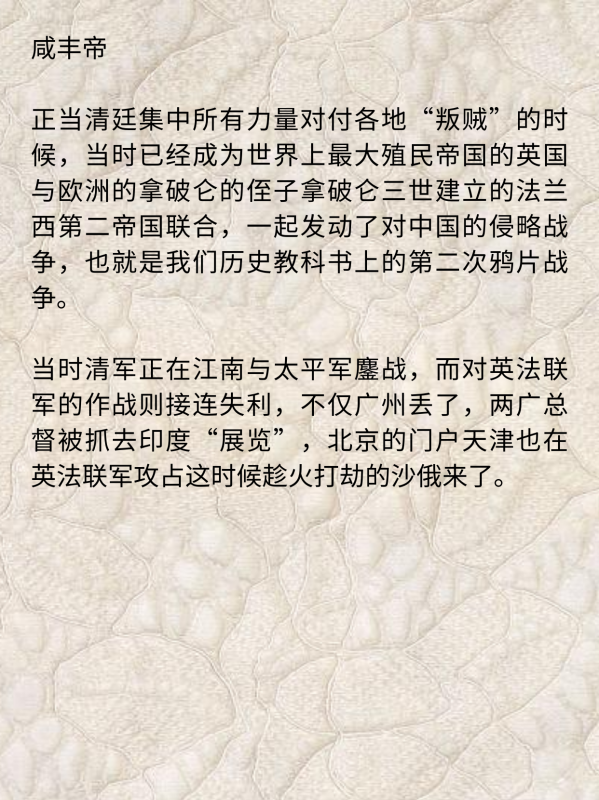 正当清廷集中所有力量对付各地“叛贼”的时候,当时已经成为世界上最大殖民帝国的英国与欧洲的拿破仑的侄子拿破仑三世建立的法兰西第二帝国联合,一起发动了对中国的侵略战争,也就是我们历史教科书上的第二次鸦片战争。