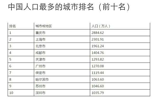 中国人口最多城市排名如下,单位(万人):