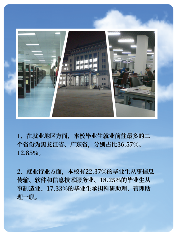 1、在就业地区方面,本校毕业生就业前往最多的二个省份为黑龙江省、广东省,分别占比36.57%、12.85%。黑龙江省作为“东北老工业基地”的重要组成部分,哈工程更是位于该省的省会城市—哈尔滨市,毕业生选择留在该省工作体现出哈工程学子有为振兴东北、援助家乡建设的美好品质,也彰显出哈工程积极履行社会职能,为本地的经济发展与社会进步不断输出高质量人才。