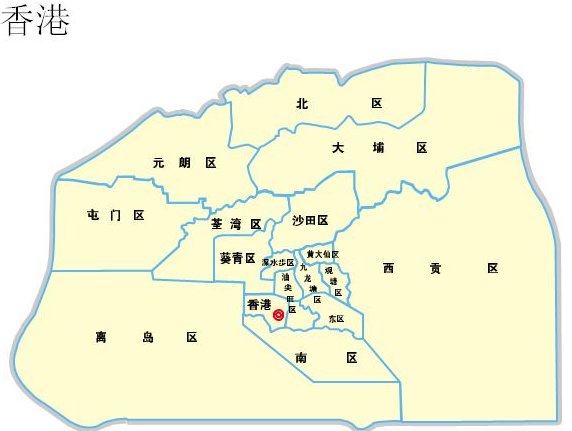 1997年7月1日,香港回归祖国,中国政府对香港恢复行使主权。香港区域范围包括香港岛、九龙、新界和周围262个岛屿四部分,行政区划分为三大块,包括香港岛、九龙半岛和新界等管辖的十八区。