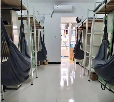 所有宿舍内都有电扇(部分寝室的可能是坏的)、空调(全部是好的),宿舍内没有独立卫生间,宿舍后有一个小阳台,部分宿舍会配备一个小的洗脸池,阳台上面用来挂衣服。每层楼左右两端各有一个公共卫生间、公共洗澡间(付费)、饮水机(100度开水,付费)。