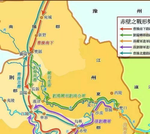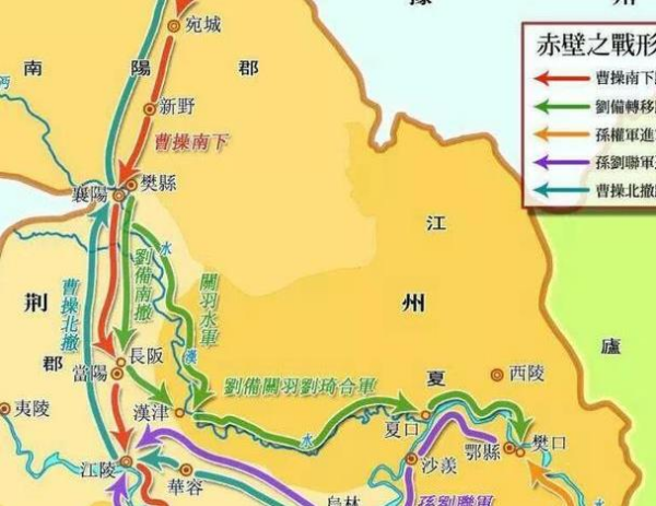 刘备在长坂坡被曹操打败之后,逃到了夏口投靠刘琦,夏口当时属于江夏郡,是今天湖北省的武汉市汉口区,然后刘备派诸葛亮出使东吴,双方结盟,孙权派周瑜、程普率领3万军队与刘备联合,周瑜、程普、刘备从夏口出发,率军沿着长江向西进军,曹操从江陵(今湖北荆州)出发沿着长江向东进军。