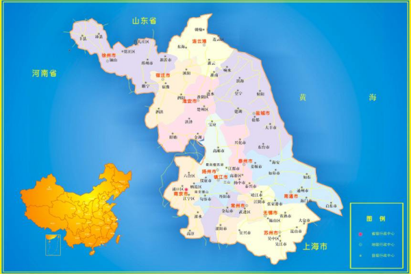 江苏,简称“苏”,是中国省级行政区,省会南京,以“江宁府”与“苏州府”之首字得名。位于中国大陆东部沿海中心、长江下游,东濒黄海,东南与浙江和上海毗邻,西接安徽,北接山东,地跨长江、淮河,京杭大运河从中穿过。