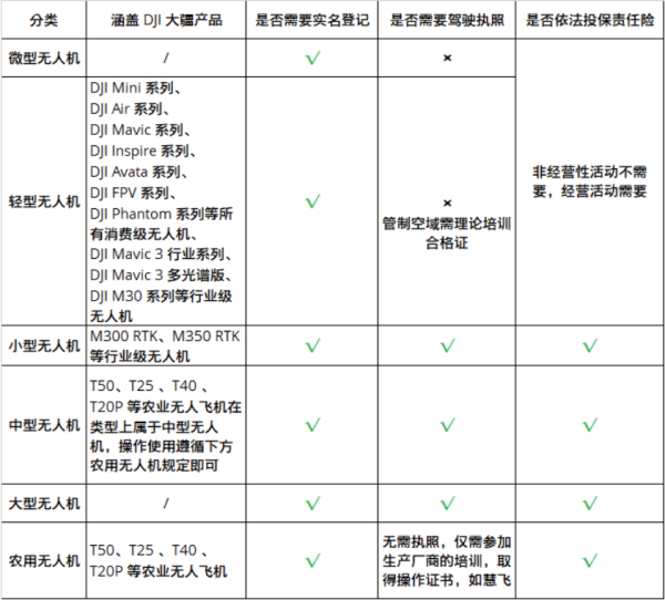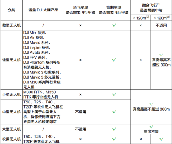 请注意:DJI Mini 系列无人机虽然重量 <250 克,但因无线电发射设备超出微功率短距离要求,因此归类为轻型无人机。