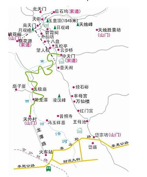 桃花峪登山口 在泰山西麓,距泰山火车站约12公里;天烛峰进山口在泰山东麓,距泰山火车站约18公里。