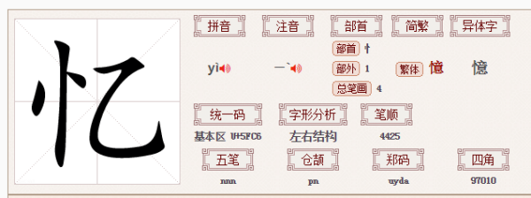 忆是一个汉字,读作yì,本意是指思念,回想,还有忆想(回想),留在记忆中,记住,忆记(记忆),回忆,追思,思议等意思。