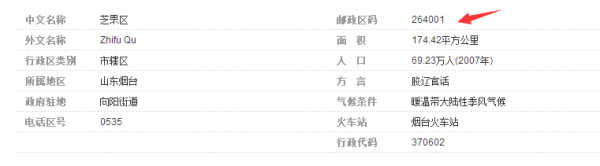 山东省烟台市芝罘区的邮政编码是264001,26代表的是山东省,40代表的是烟台市,01代表的是芝罘区的投递局。