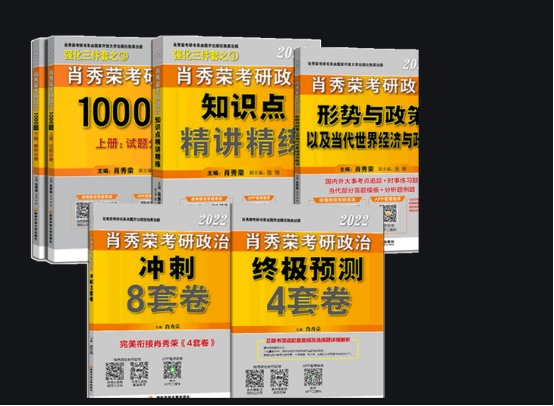 (2)考研政治:考研政治的用书是肖秀荣精讲精练、1000题、知识点提要、徐涛冲刺背诵手册、肖秀荣考点预测、肖秀荣形势政策、徐涛小黄书、肖四肖八。