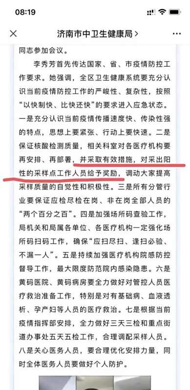 这张图片展示了山东某地奖励政策的公文,强调了奖励机制的存在。然而,这也可能引发一些人的不正当行为,试图通过制造或报告阳性病例来获取奖励。