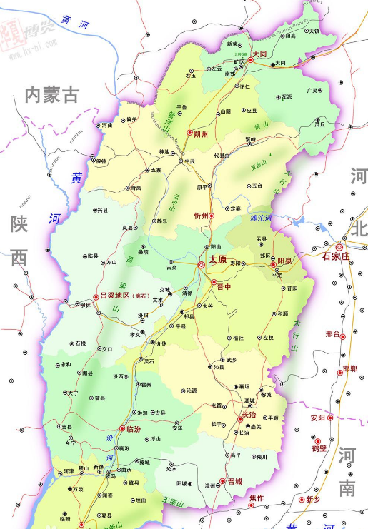 东以太行山为界,与河北为邻;西、南隔黄河与陕西、河南相望;北以外长城为界与内蒙古毗连。疆域轮廓呈东北斜向西南的平行四边形,南北间距较长,纵长约682千米。