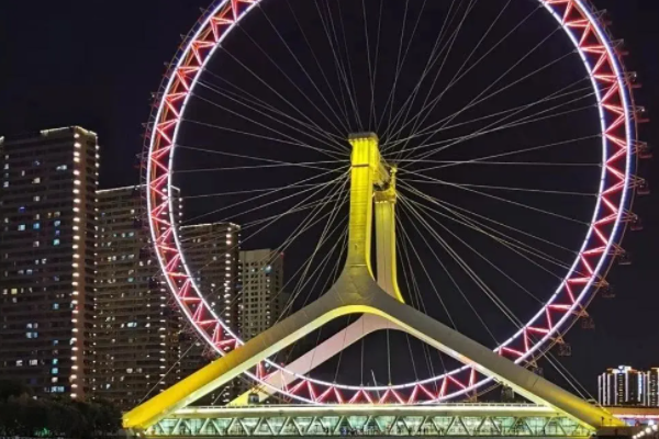天津之眼是一座横跨在海河上的摩天轮,就像是桥上的一只眼睛,这里也是天津最著名的的地标之一,每到夜晚华灯初上时,天津之眼的彩灯柔美,无数游客会来到这里,拍摄全景或是乘坐观光,享受别样的浪漫。