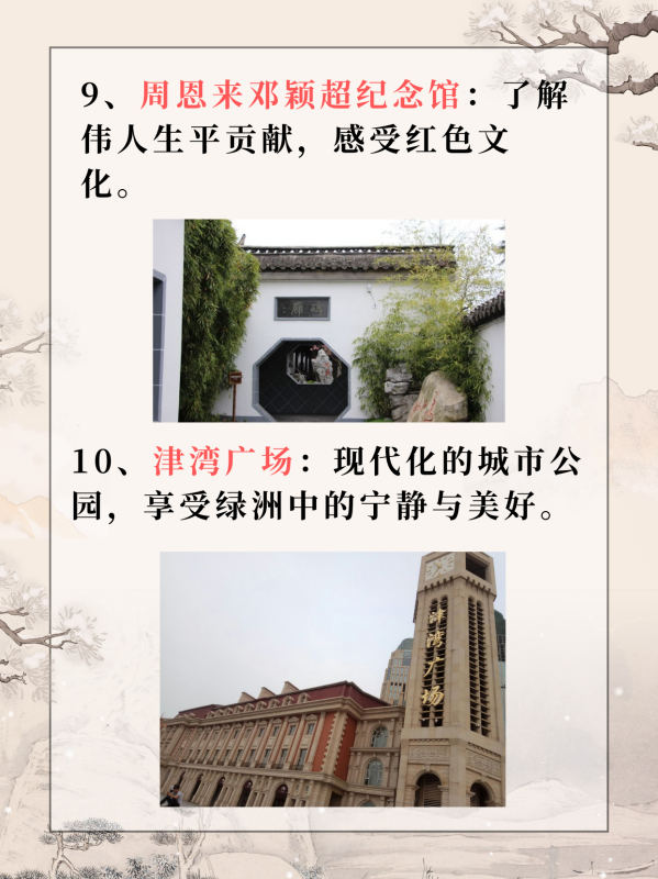 9、周恩来邓颖超纪念馆:周恩来邓颖超纪念馆是一处纪念伟人的纪念馆,这里展示了周恩来和邓颖超的生平和贡献。走进纪念馆,您可以更加深入地了解他们的事迹和精神,感受红色文化的独特魅力。