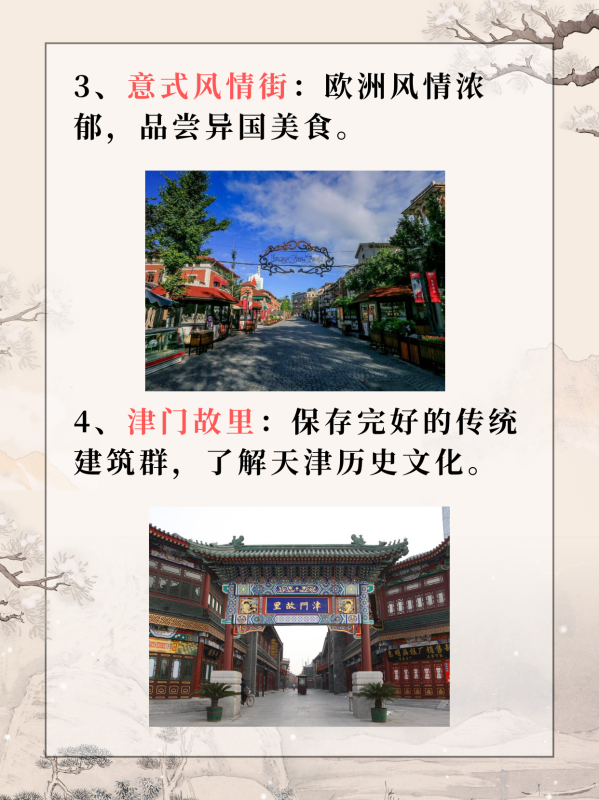 3、意式风情街:天津的意式风情街充满了欧洲风情,仿佛置身于异国他乡。这里的建筑、街道、咖啡馆、酒吧和餐厅都充满了欧洲特色,让您在品尝美食的同时,感受异国文化的独特魅力。