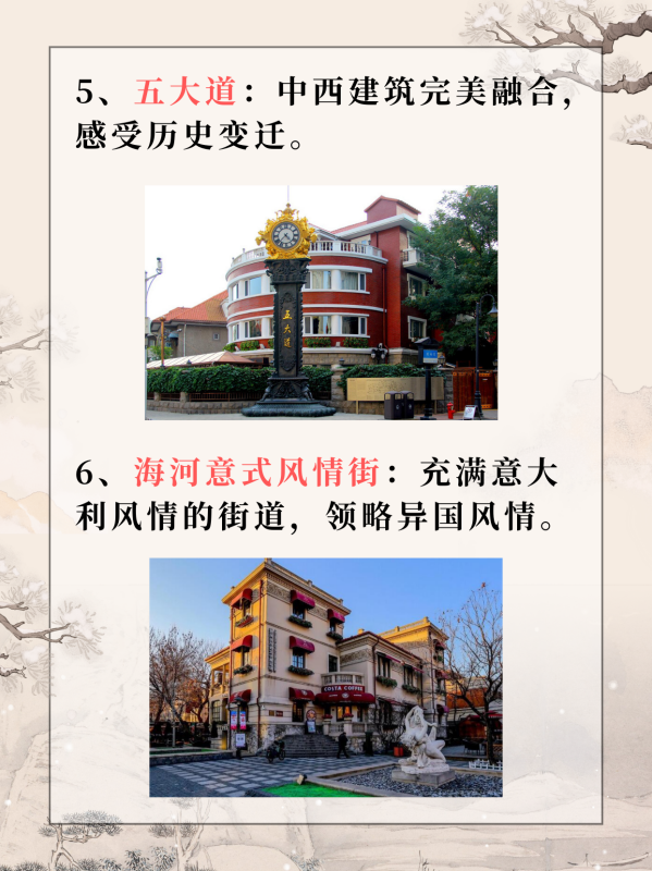 5、五大道:五大道是天津最具历史价值的住宅区之一,这里保存了大量中西建筑风格的建筑。漫步在五大道上,您可以欣赏到中西文化的交融之美,感受到历史变迁的痕迹。