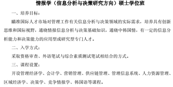 情报学专业(信息分析与决策研究方向)是天津师范大学与韩国世翰大学合作办学硕士研究生专业,所属院系:国际教育交流学院。