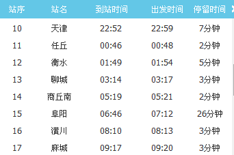 站次 站名 到达时间 开车时间 停车时间 运行时间