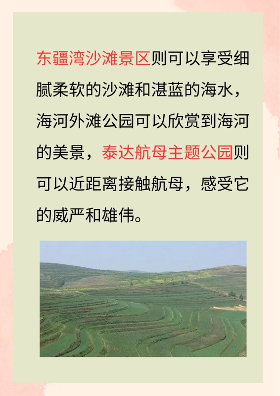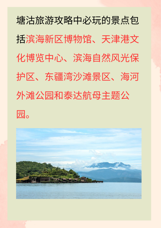 塘沽旅游攻略中必玩的景点包括滨海新区博物馆、天津港文化博览中心、滨海自然风光保护区、东疆湾沙滩景区、海河外滩公园和泰达航母主题公园。这些景点涵盖了自然风光和文化历史,可以让游客全方位地了解和体验塘沽的独特魅力。