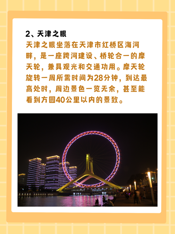 2、天津之眼:天津之眼坐落在天津市红桥区海河畔,是一座跨河建设、桥轮合一的摩天轮,兼具观光和交通功用
