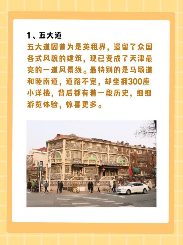 1、五大道:五大道因曾为是英租界,遗留了众国各式风貌的建筑,现已变成了天津最亮的一道风景线