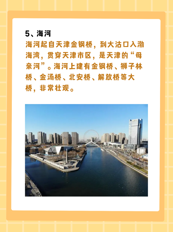 5、海河:海河起自天津金钢桥,到大沽口入渤海湾,贯穿天津市区,是天津的“母亲河”