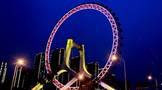 摩天轮高度为120米,轮外装48个透明座舱,每舱可乘8个人,舱内舒适宽敞,有空调调节温度,可同时供384人观光,依据季节不同安排运营时间。摩天轮依靠电力驱动,匀速旋转,约30分钟左右旋转一周。座舱到达最高处时,乘客能看到方圆数十公里的景致,海河风貌尽收眼底。