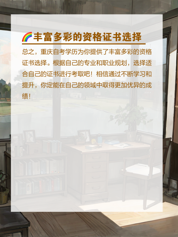 总之,重庆自考学历为你提供了丰富多彩的资格证书选择。根据自己的专业和职业规划,选择适合自己的证书进行考取吧!相信通过不断学习和提升,你定能在自己的领域中取得更加优异的成绩!