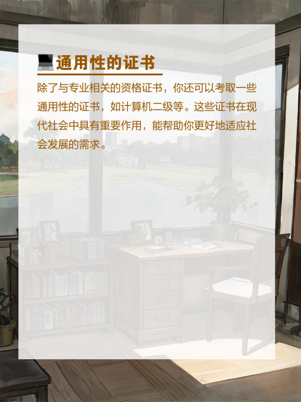 除了与专业相关的资格证书,你还可以考取一些通用性的证书,如计算机二级等。这些证书在现代社会中具有重要作用,能帮助你更好地适应社会发展的需求。