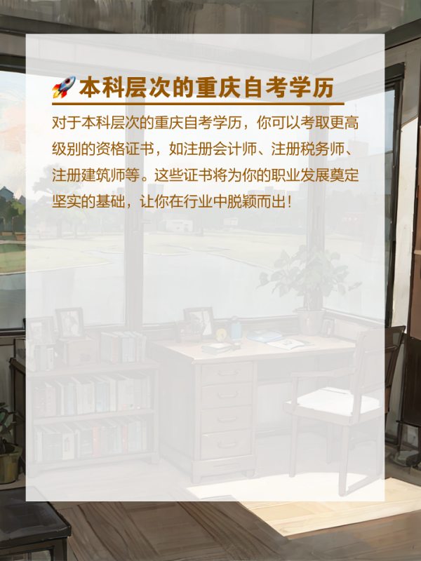 对于本科层次的重庆自考学历,你可以考取更高级别的资格证书,如注册会计师、注册税务师、注册建筑师等。这些证书将为你的职业发展奠定坚实的基础,让你在行业中脱颖而出!