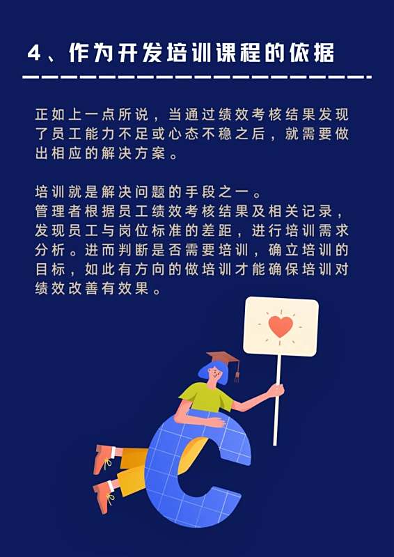 4.作为开发培训课程的依据,正如上一点所说,当通过绩效考核结果发现了员工能力不足或心态不稳之后,就需要做出相应的解决方案。