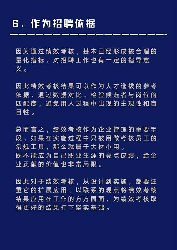 6.作为招聘依据,因为通过绩效考核,基本已经形成较合理的量化指标,对招聘工作也有一定的指导意义。因此绩效考核结果可以作为人才选拔的参考依据,通过数据对比,检验候选者与岗位的匹配度,避免用人过程中出现的主观性和盲目性。