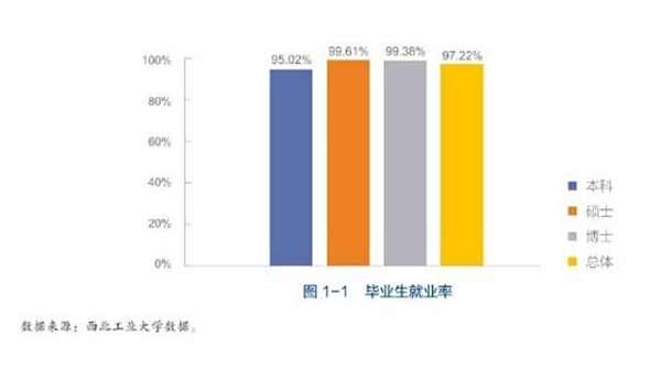 对于像西北工业大学或者中南大学这类985来说,关注学校的就业率也太小看985了,对于这两所学校的学生来说只要想找工作,基本上不存在找不到工作的情况。图中是2019年西北工业大学的毕业生就业率,其中本科生就业率为95.02%,硕士生就业率为99.61%,博士生就业率为99.38%,整体就业率为97.22%。