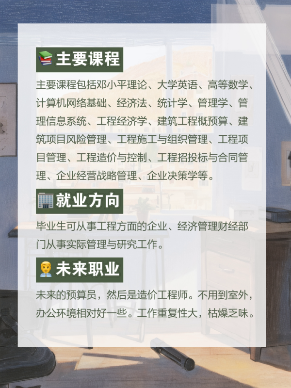 主要课程包括邓小平理论、大学英语、高等数学、计算机网络基础、经济法、统计学、管理学、管理信息系统、工程经济学、建筑工程概预算、建筑项目风险管理、工程施工与组织管理、工程项目管理、工程造价与控制、工程招投标与合同管理、企业经营战略管理、企业决策学等。